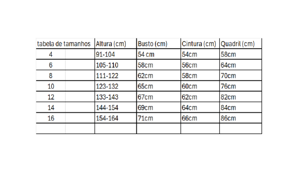 Tamanhos: 6,8,10,12,14,16