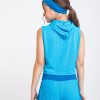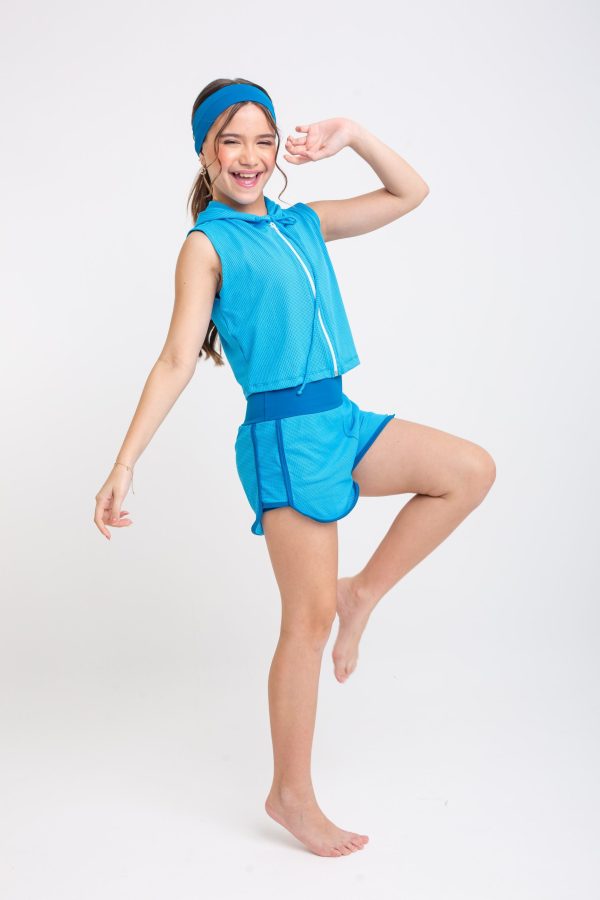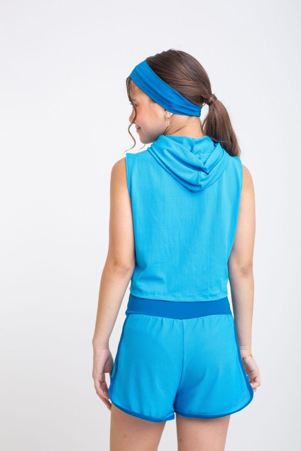 Colete confeccionado em dry fit de poliamida com zíper destacável permitindo a criança ou a adolescente usá-lo completamente aberto ou então totalmente fechado. Alem disso ele possui também um capuz na parte de trás.