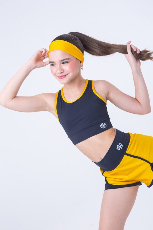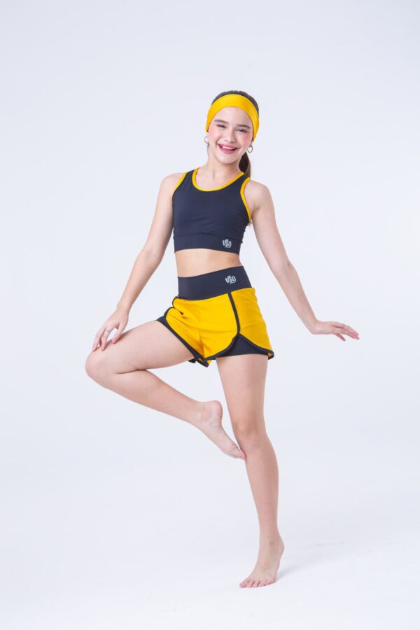 Conjunto de short duplo dourado com preto confeccionado em tecidos de poliamida com elastano. O tecido dourado compõe o look dando um glow na peça e deixando ainda mais bonita a composição de cores.