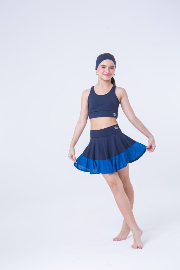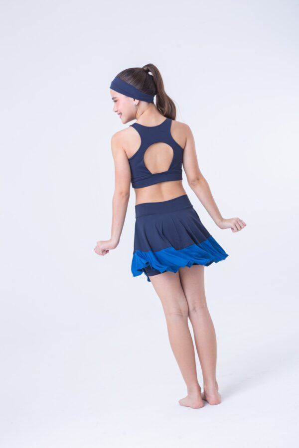Conjunto de short saia e top confeccionado em tecido de poliamida com elastano. Tecido de toque macio e frio que adapta perfeitamente ao corpo. A barra da saia é confeccionada em dry fit de poliamida. O conjunto acompanha a faixinha de cabelo. Modelo veste tamanho 14 anos.