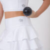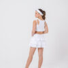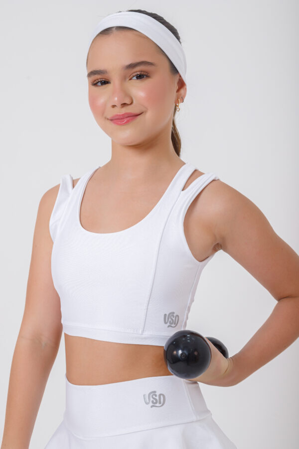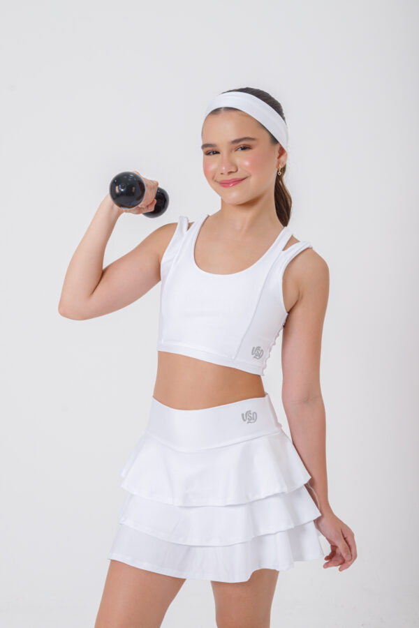 Conjunto de short saia e top com confeccionado em tecido de poliamida. O short saia é composto por 3 babados e tem o shortinho embaixo então a criança ou a adolescente não precisa se preocupar quando for realizar movimentos de grandes amplitudes, pois o tecido tem bastante elasticidade e consegue acompanhar o movimento. Composição de 85% poliamida e 15% elastano. O tecido possui um leve brilho e promove conforto e elasticidade durante da prática da atividade física. O tecido possui ainda fator de proteção solar.