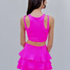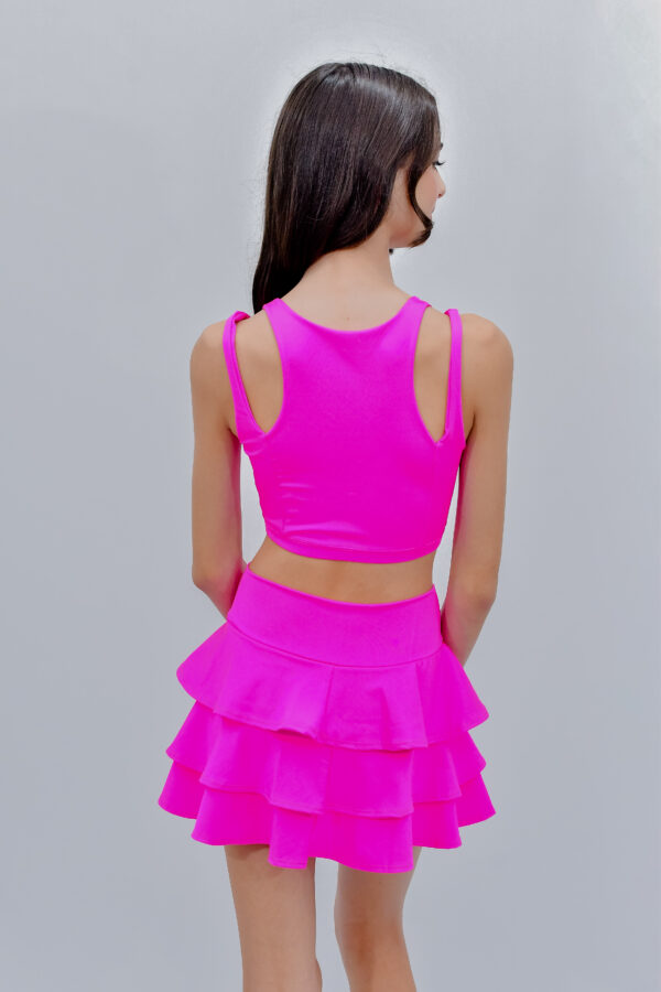 Conjunto de short saia e top com confeccionado em tecido de poliamida. O short saia é composto por 3 babados e tem o shortinho embaixo então a criança ou a adolescente não precisa se preocupar quando for realizar movimentos de grandes amplitudes, pois o tecido tem bastante elasticidade e consegue acompanhar o movimento. Composição de 85% poliamida e 15% elastano. O tecido possui um leve brilho e promove conforto e elasticidade durante da prática da atividade física.