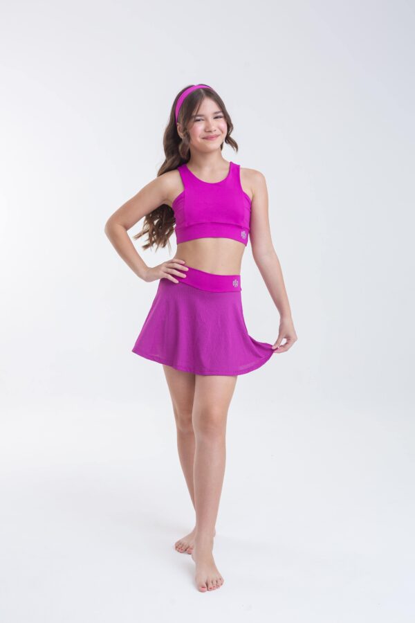 Conjunto de short saia e top confeccionado em poliamida com elastano. A saia foi confeccionada em dry fit de poliamida .Tecido macio, confortável e toque frio excelente qualidade e ideal para uso na prática de atividades físicas!